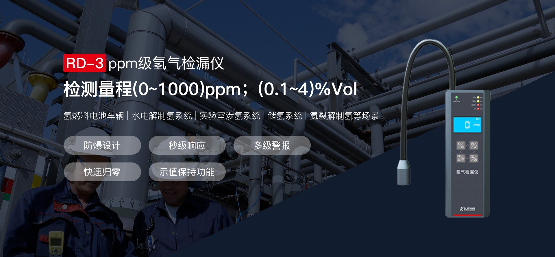 電解水、天然氣、氫分裂制氫,輸氫管道、氫氣置換,制氫站、加氫機(jī)、卸氣柱、撬裝站、氫燃料電池汽車及系統(tǒng)測試臺架、熱電聯(lián)供、氫滲氫實(shí)驗(yàn)室、涉氫生產(chǎn)廠房、氫氣氣瓶間等場合中的氫氣濃度、純度、濕度檢測。